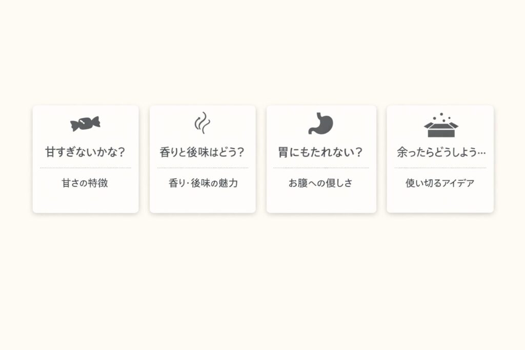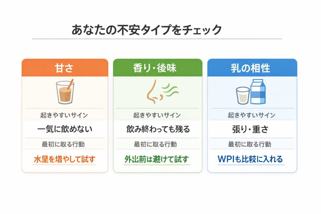 買う前の迷いは、甘さ・香りと後味・乳の相性のどこに不安があるかで、進め方が変わります。