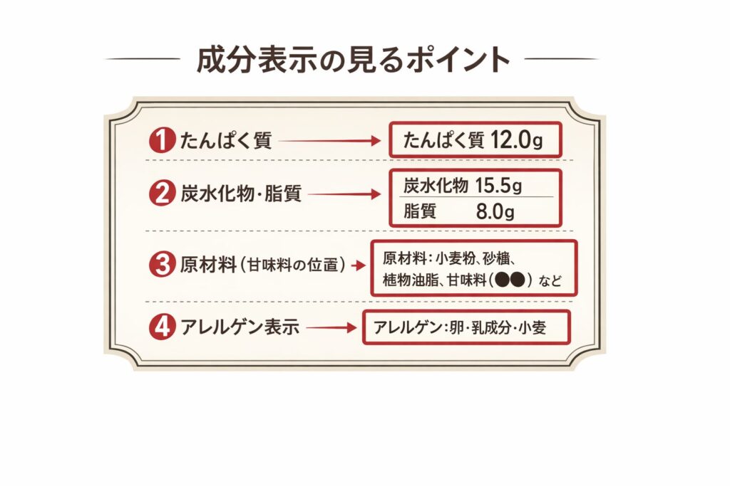 派生シーンとして、減量期で糖質を気にしている人は、炭水化物の数字に意識が向きがちです。もちろん重要ですが、味の合否に直結するのは甘味料・香り・後味です。見る順番を固定しておくと、迷いが増えません。