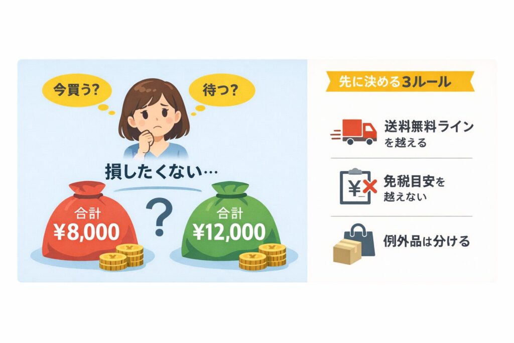まとめ買い派は、まとめるのではなく“設計する”意識が必要です。範囲を超えそうなら分割して、同じルールを複数回使うほうが支払総額が読みやすくなります。