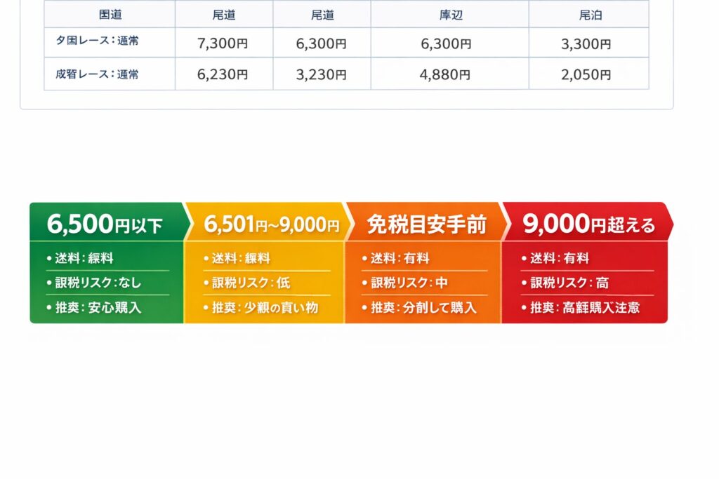 | カート金額帯 | 送料の目安 | 課税リスクの目安 | 向いている人 | 推奨アクション |