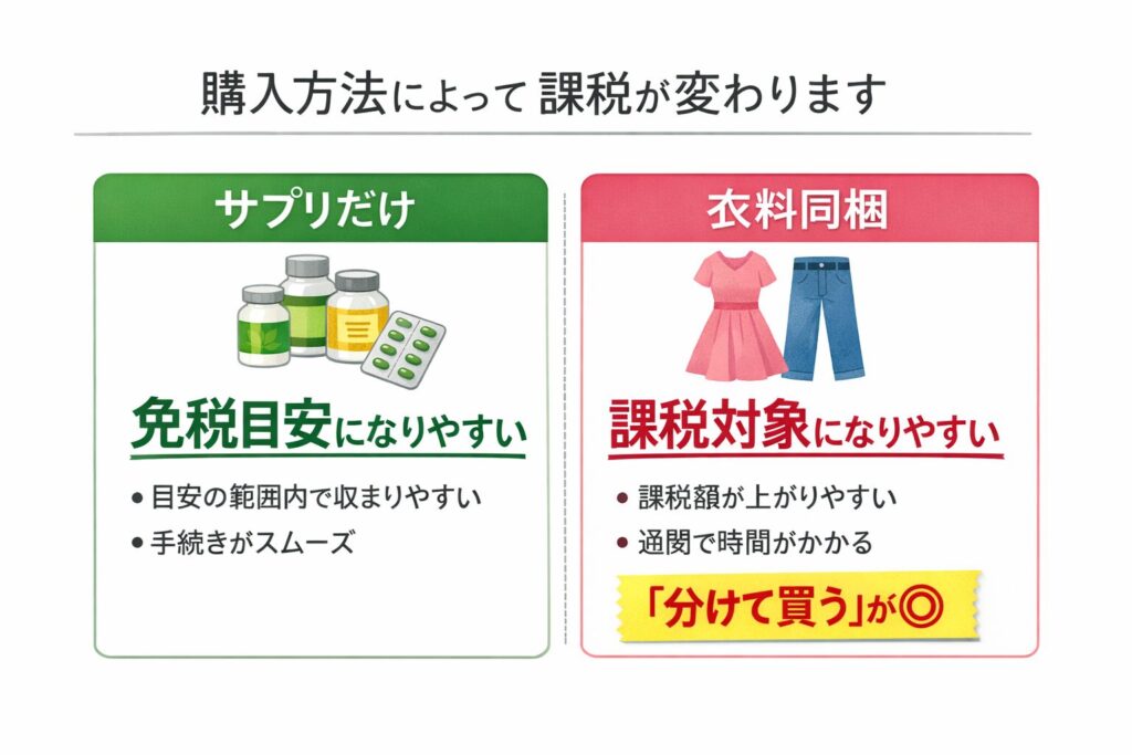 | サプリ・食品だけ | 免税目安どおりになりやすい | 金額帯だけ守る | 公式の税の注意事項 |