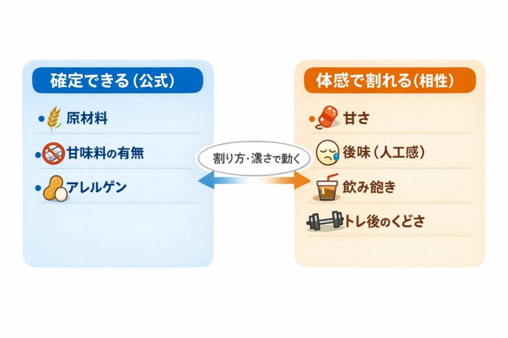 似た場面として、チョコ系やミルクティー系でも同じことが起きます。甘味料が合わない人はフレーバーを変えても続かないので、味選び以前に前提を固定したほうが早い。