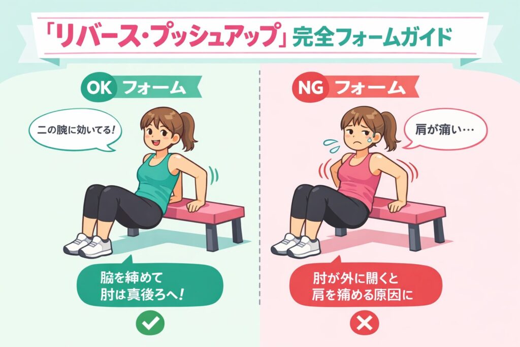 このトレーニングは、二の腕の裏側にある「上腕三頭筋」という筋肉にピンポイントで効かせることができます。リバース・プッシュアップで最も大切なのは、回数よりも「正しいフォーム」です。正しいフォームで行うことで、怪我を防ぎ、最短で効果を実感できます。