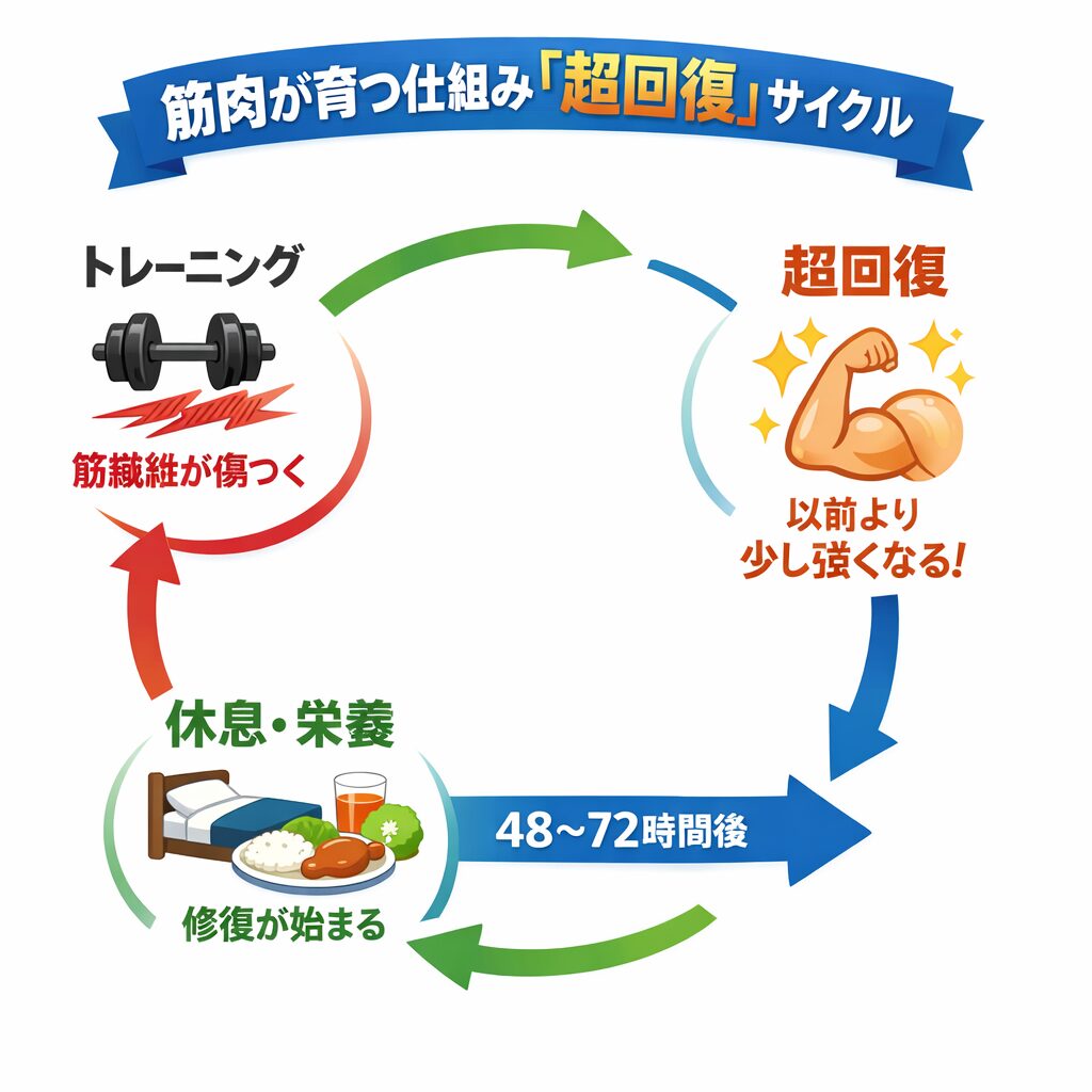 最新のトレーニング科学では、「筋肉は、休んでいる間に成長する」というのが常識です。このメカニズムを「超回復」と呼びます。