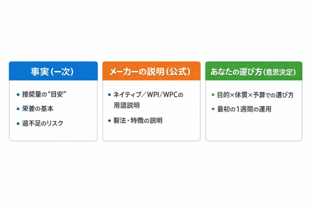 この記事は、その状態から抜け出すための最短ルートを1つに固定します。最初に必要量と“続く運用”を決める→用語の違いを比較軸に翻訳する→お腹の不安を先に潰す→目的に当てはめて候補を絞る→最初の1週間で安定させる→最後の3チェックで決め切る。ここまで辿り着けば、「高い買い物だったのに合わなかった」を避けながら、納得して継続できます。