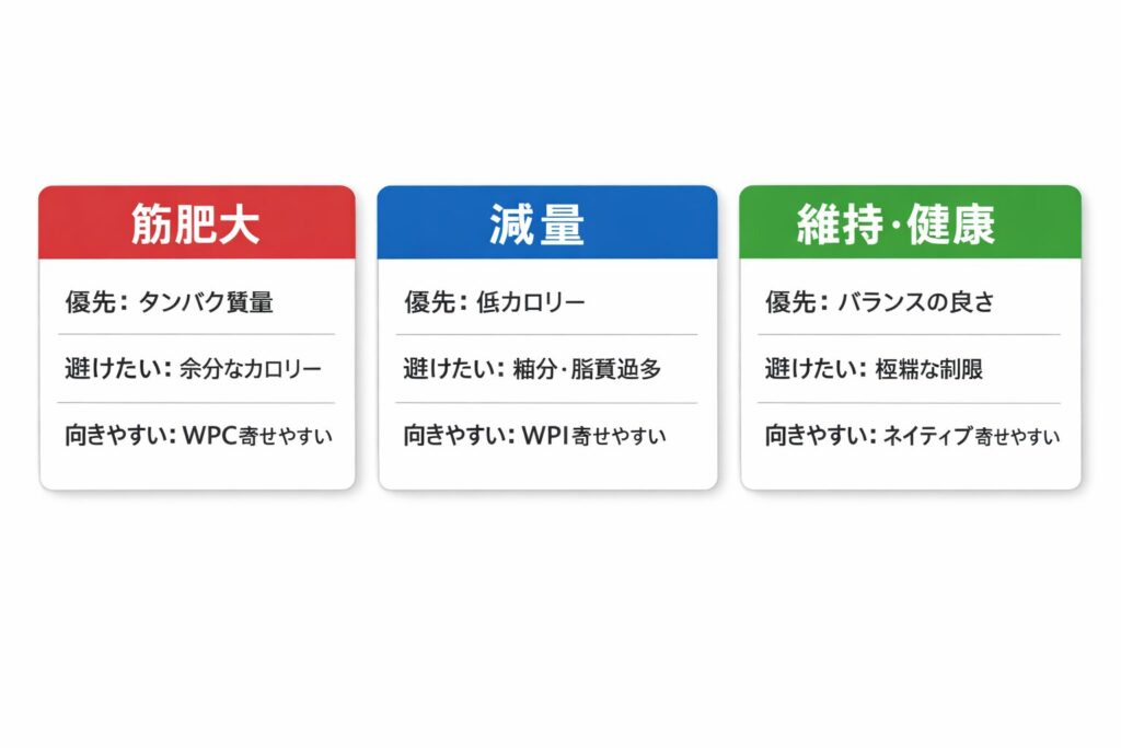 ここまでで比較の土台と不安の対処が揃いました。次は「自分の目的なら、どの優先順位が自然か」を当てはめます。筋肥大・減量・維持では、同じホエイでも“気になるポイント”が違います。