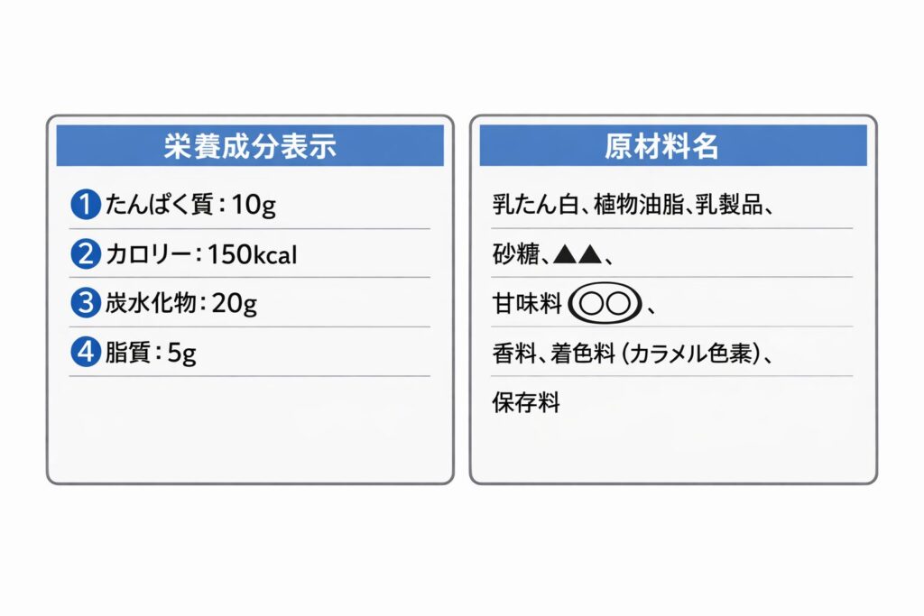 最初に見るのは「1回分で、たんぱく質がどれだけ入るか」。次に「目的に関係する数字(カロリー・糖質・脂質)」。最後に「避けたい原材料があるか」です(根拠の考え方は厚生労働省の食事摂取基準の整理が参考になります:厚生労働省)。