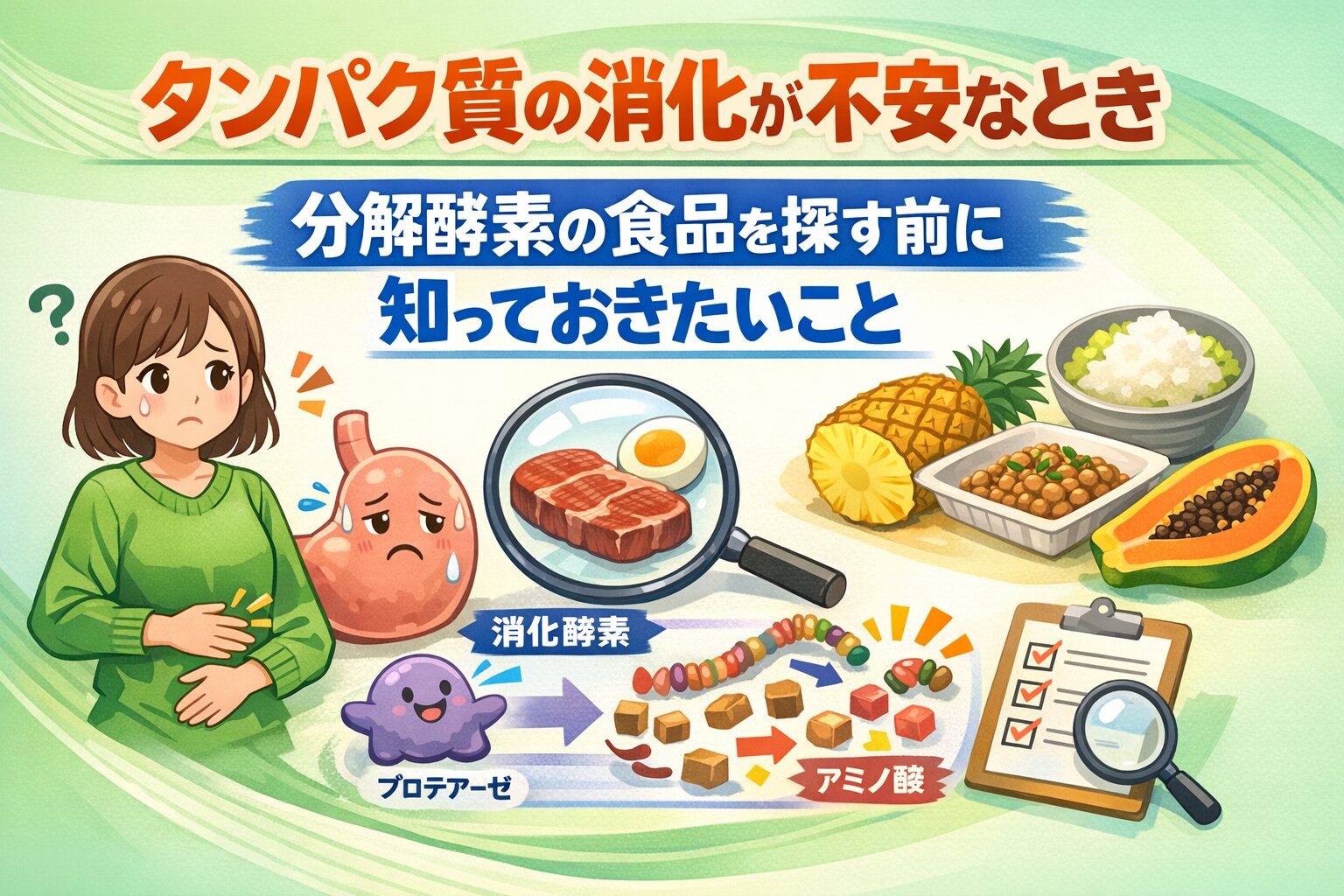 プロテインを飲んだあとにお腹が張って、夕食のあとも胃が重い。スマホで「タンパク質 分解酵素 食品」と検索しているのは、酵素を足せば解決するのか、それとも別の原因なのかを今すぐ整理したいからだと思います。