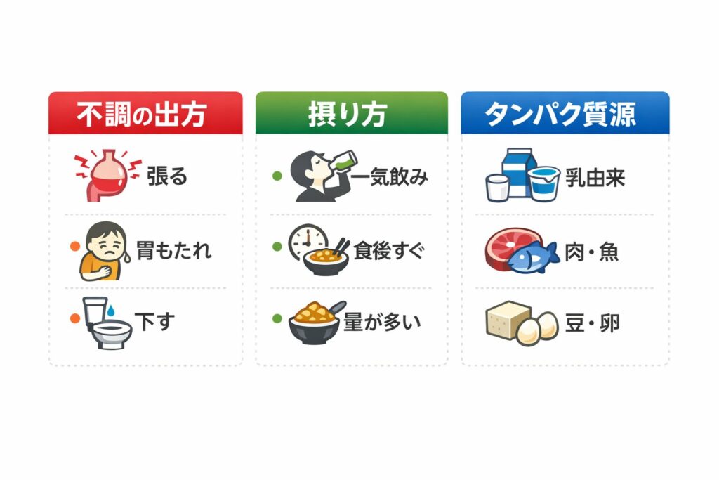 量を増やすほど筋肉がつく、という気持ちは分かります。でも胃腸がつらいと続きません。まずは総量を守りながら、1回の負担を下げる方向へ寄せるほうが現実的です。