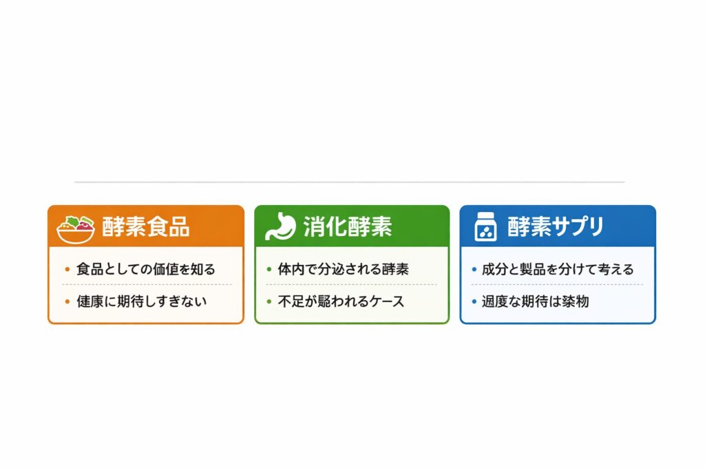 迷いが長引く人は、情報の量が多いというより、言葉が混ざっていることが多いです。ここでは、同じ“酵素”という言葉でも、目的と扱いが違うことを切り分けます。健康情報の扱い方は、公的機関でも「成分が入っていること」と「効果があること」を分けて考える姿勢が示されています(出典:厚生労働省)。