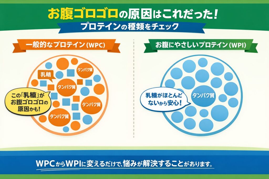 最も簡単で効果が期待できる解決策が、今飲んでいるプロテインを「WPI(ホエイプロテイン・アイソレート)」という種類に変えることです。