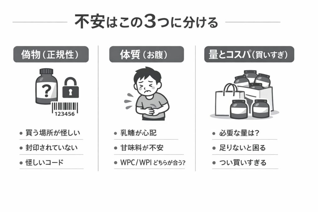 例えば、トレーニング終わりにセールを見つけて、勢いで「いちばん安い出品」を選んでしまうケース。届いてから「ラベルが違う気がする」「粉の匂いがいつもと違う気がする」と悩み始めると、そこで時間が溶けます。