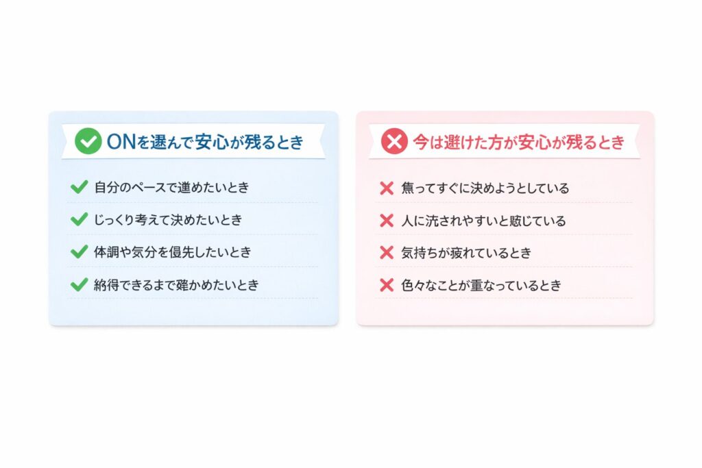 正規性の確認ができ、体質の不安が小さく、買う量が現実に合っている。条件が揃うなら、ONは有力な選択肢になります。逆に、どれかが欠けるなら、今は避けた方が安心が残ります。