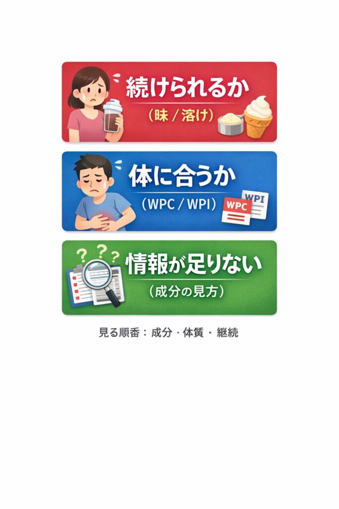 派生シーンとして、ダイエット中で食事量を減らしている人ほど「失敗したくない」が強くなります。食事からのたんぱく質が減っている自覚があると、プロテインは“保険”になります。だからこそ、買って飲めなかった時の損失が大きく感じる。最初に不安の種類を分けて、次の章で“数字で絞る”準備をしておきます。