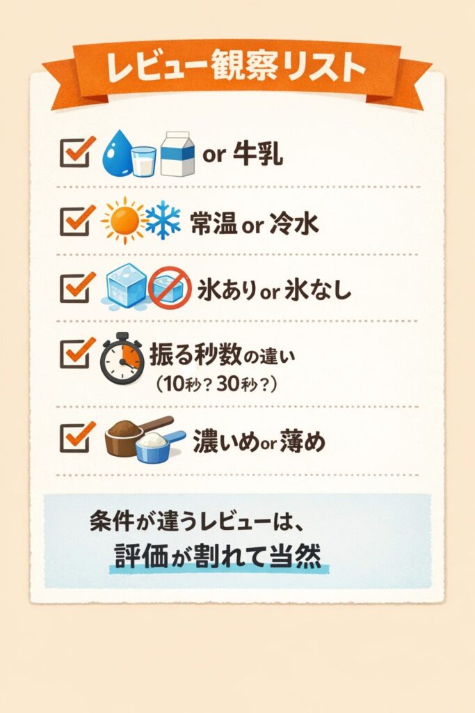 溶けやすさも、単に粉の品質だけの問題ではありません。シェイカーに入れる順番、水の温度、振る時間で体感は変わります。溶け残りや泡立ちがストレスになる人は、作り方を固定して比較すると迷いが減ります。レビューを読むときも「水で作ったのか、牛乳で作ったのか」「氷を入れたのか」など条件が混ざっているので、そのまま信じると判断がブレます。