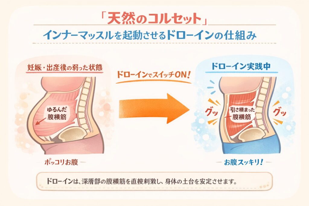 しかし、妊娠・出産によって、このインナーマッスルは引き伸ばされて働きが弱くなってしまいます。ドローインは、この弱ってしまったインナーマッスルを安全に活性化させるための、最も基本的で効果的なアプローチです。