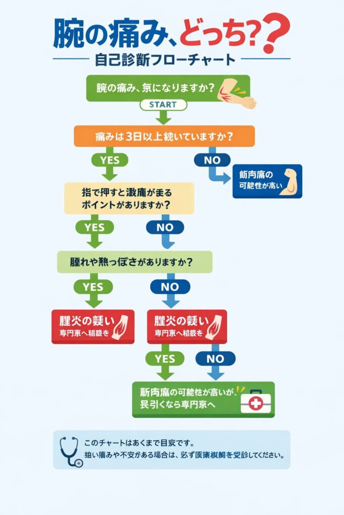 • 腱炎の疑い: 肘の後ろなど、特定の場所を指で押すと激痛が走る。腕を伸ばすなど、特定の動きで「ピリッ」とした鋭い痛みが走る。
