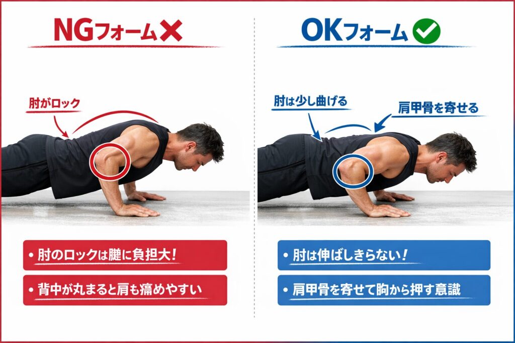 3. フォームの徹底見直し: この機会に、ご自身のトレーニングフォームを見直しましょう。特に腕立て伏せやベンチプレスでは、肘を完全に伸ばしきる(ロックする)動作が腱へのストレスを増大させます。