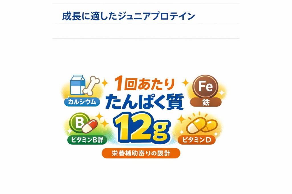 まず象徴的なのが、1回あたりのたんぱく質量です。ジュニアプロテインは「食事に足しやすい量」を前提に作られていることが多く、たんぱく質“だけ”を強く押し上げる設計ではありません。さらに、カルシウムや鉄、ビタミンなどの“成長期を意識した栄養素”が強化されているのが特徴です。つまり方向性は「たんぱく質+栄養の底上げ」で、筋トレ向けホエイのような「たんぱく質を高密度で入れる」タイプとは役割が違います。
