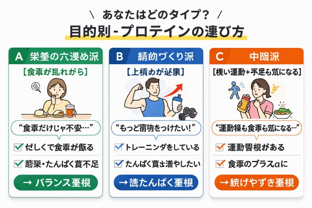 | 食事が偏りがちで、たんぱく質不足も気になる(栄養補助) | 高い | たんぱく質に加えて栄養素も一緒に補いやすい | 1日の食事でたんぱく質を明確に増やしたい意識が強い |