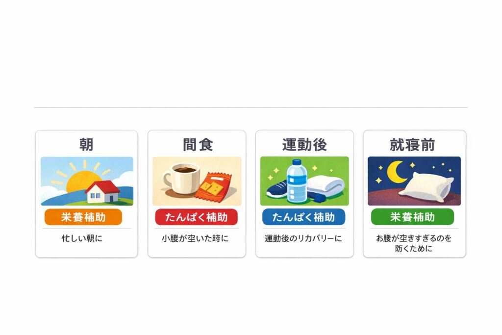 | 朝 | 朝食の不足を埋める(栄養補助) | 朝が軽い/時間がない | 朝食はしっかり食べられる | “朝の固定”にすると迷いが消える |