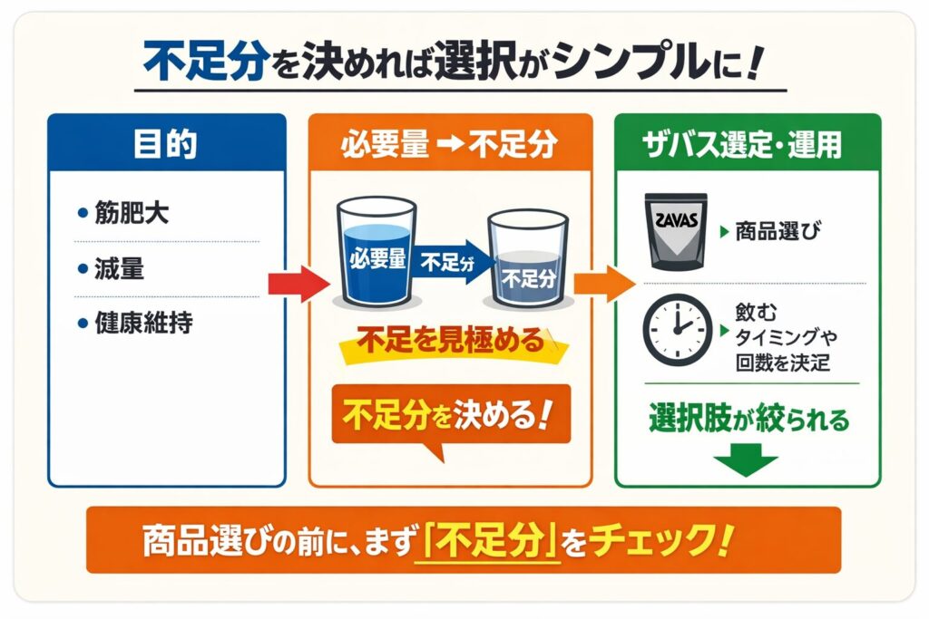 迷いを最短で減らすコツは、商品名から入らないことです。最初に決めるのは「どれを買うか」ではなく、「今日の食事で足りないたんぱく質を、何gだけ補うか」。不足分が決まると、ザバスの中で選ぶべき候補が一気に減り、買ってからの飲み方もブレません。