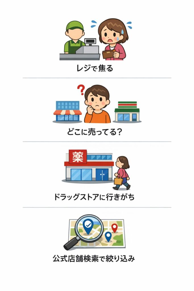 実際に多い失敗は、コンビニを3軒回ってからドラッグストアに行く動きです。歩いて回れる範囲があるほど「次こそあるはず」と期待してしまい、時間だけが溶けます。コンビニに置いてある店があるのは事実でも、置き場が一定ではなく、入荷も店舗ごとに差が出やすいからです。今日中に必要なら、まず“当たりやすいカテゴリ”に寄せたほうが不安が減ります。
