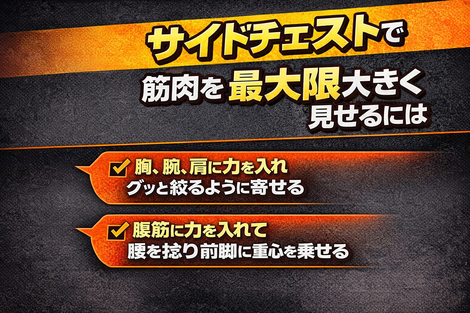 結論として、サイドチェストは筋肉量より「形を作る順番」で見え方が決まります。脚で台座を作り、胸郭(肋骨まわり)で胸を前に出し、腕の引き合いで胸を押し込み、最後に体幹の回旋を少し足す。この一本化だけ先に固定すると、同じ体でも厚みの出方が変わります。