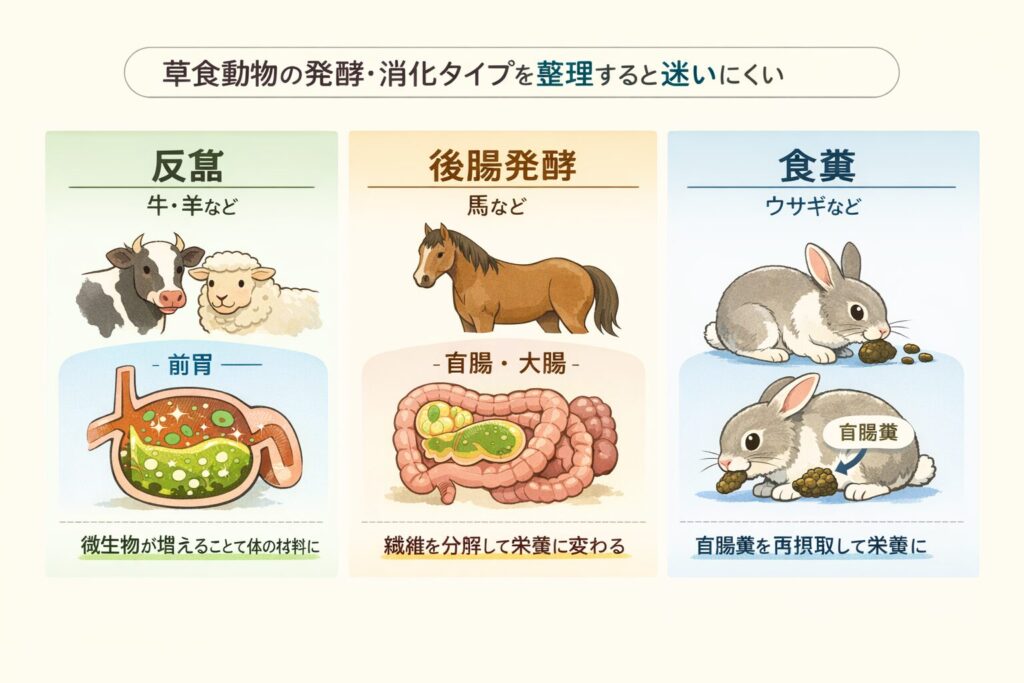 | 草食は全部同じ仕組み | 牛・馬・ウサギの差が消える | 発酵の場所と回収の導線が動物で違う | 3タイプ分岐 |