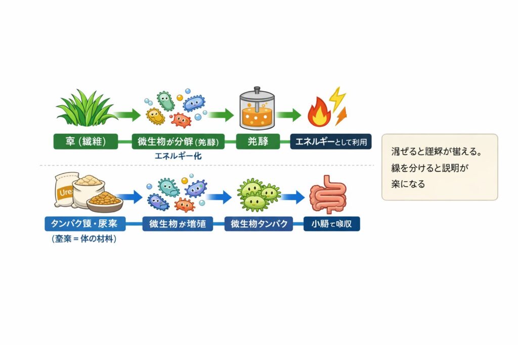「草をタンパク質に変える」という言い方が誤解を生むのは、草がそのままタンパクに置き換わるように聞こえるからです。実際には、草(とくに繊維)は微生物に分解されて発酵が起き、発酵で生まれた産物がエネルギーとして使われます。一方で、タンパクの材料は窒素側にあります。エネルギーと窒素がそろうと、微生物が増え、その微生物そのものが“食べられるタンパク”として回収される、という二本立てで見るのが安全です。
