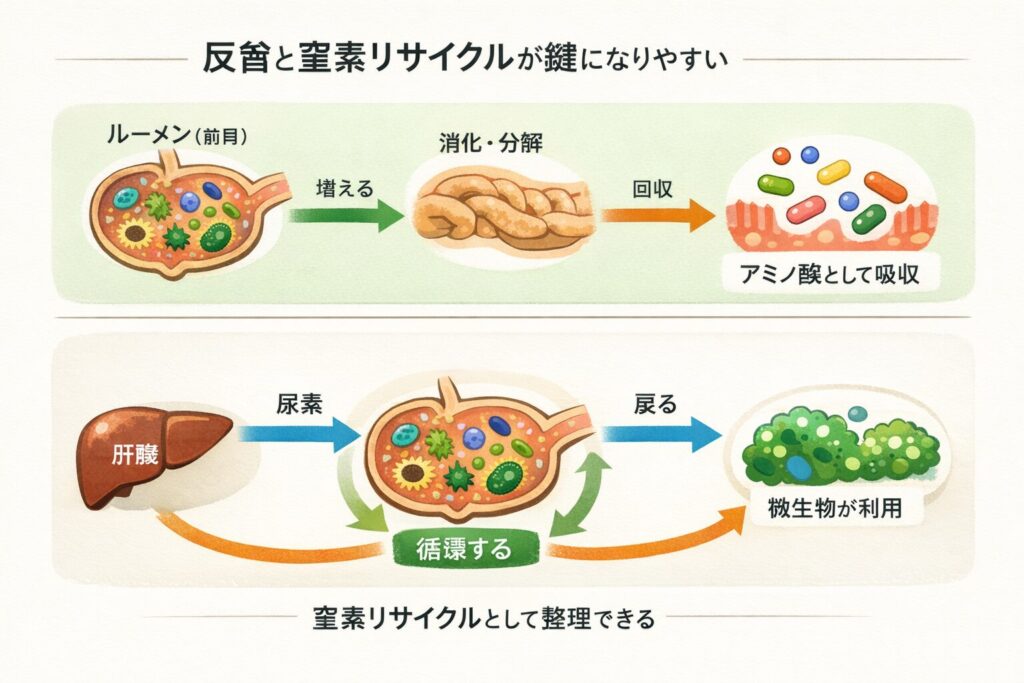 さらに反芻の説明を強くするのが、尿素リサイクルという窒素の回し方です。肝臓で作られた尿素が、体の外に出るだけでなく、ルーメン側へ戻って微生物に利用される経路があります。窒素が回ることで、微生物が増える条件が整いやすくなり、結果として微生物タンパクの供給が安定します。尿素の移行とルーメン内での利用については、反芻における尿素輸送と加水分解を扱う総説でも整理されています(出典:PMC)。
