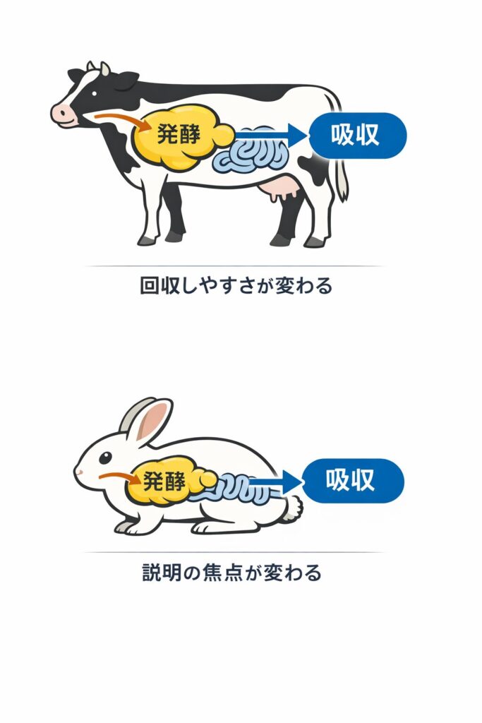次は、同じ草食でも「発酵の場所」が違うと何が変わるかを見ていきます。