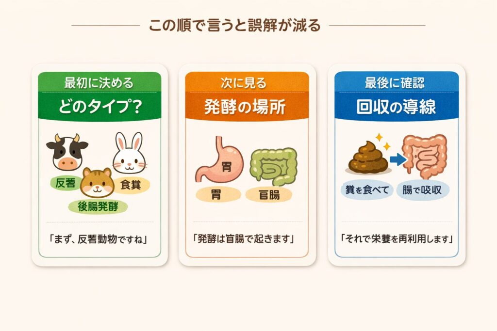 追加で聞かれたときに詰まらないためには、最初に動物のタイプを確定させるのが近道です。話題が牛なのに馬の話を混ぜると、相手の疑問が増えます。話題がウサギなのに反芻の説明で押すと、行動(食糞)の意味が消えます。タイプを決めてから、発酵の場所と回収の導線を押さえる。この順番だけ守れば、短くても誤解が増えません。