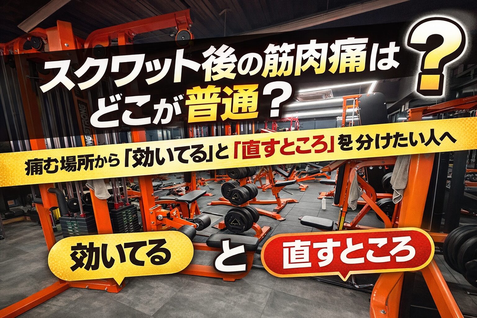 スクワットをやった翌日、ジムの更衣室で立ち上がった瞬間に「前ももが痛い」。階段を降りるたびに膝まわりも気になる。狙っていたのはお尻なのに、これで合っているのか分からなくなって、スマホで「スクワット 筋肉痛 どこ」と打った——この記事は、その場面に合わせて書いています。