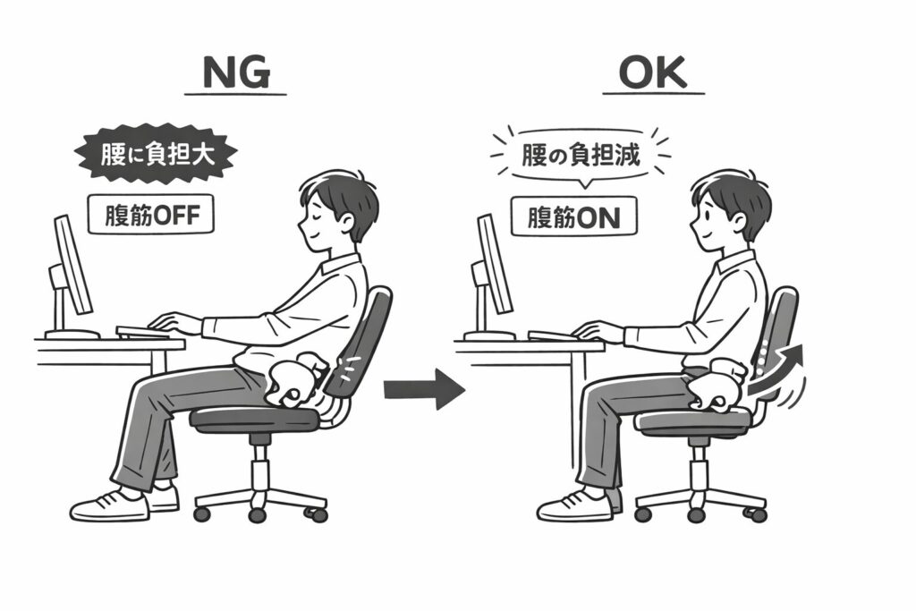 そして重要なのは、腹横筋を鍛えるための第一歩が「正しい姿勢」であるという関係性です。骨盤を立てて正しく座ること自体が、腹横筋を持続的に刺激するトレーニングの始まりとなります。つまり、腹横筋の強化は、腰痛予防に直結するのです。