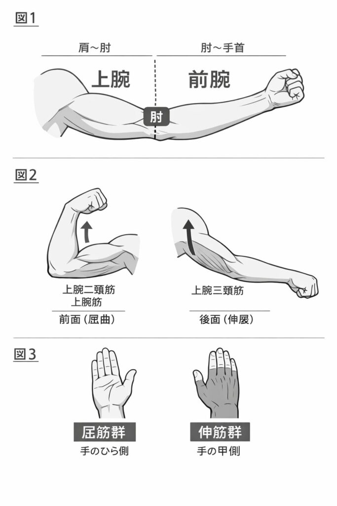まず「上腕」と「前腕」を分けるだけで、半分は解決します