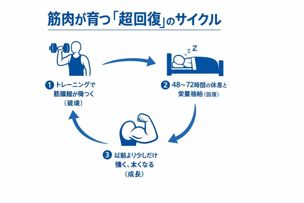 そして、この原則と密接に関係するのが「超回復」という体の仕組みです。トレーニングで筋繊維を意図的に傷つけ、その後の休息期間(約48〜72時間)に栄養を補給することで、筋肉は以前よりも少しだけ強く、太く回復します。この「トレーニング(破壊)」と「休息(超回復)」の相互作用サイクルこそが、筋肉を育てる本質です。