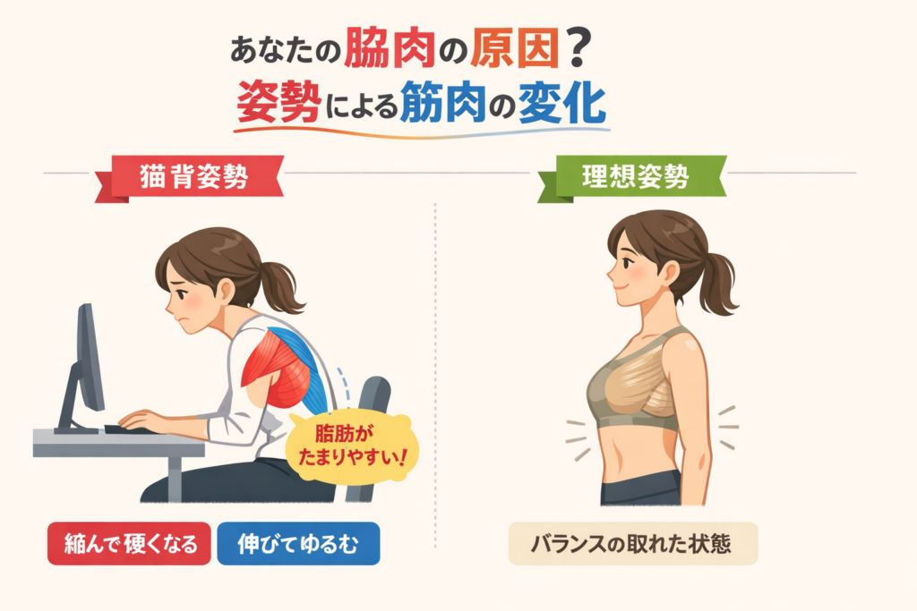 実は、長時間のデスクワークが引き起こす「猫背」や「巻き肩」といった姿勢のクセが、結果として脇肉が付きやすくなる大きな原因になっています。心当たりはありませんか?